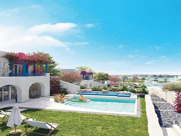 تشمل قرية ماونتن فيو الساحل الشمالي وحدات رائعة التصميم من فيلات وشاليهات صممت على الطراز اليوناني الراقي، محاطة بمساحات خضراء مع الألوان البيضاء للوحدات.
